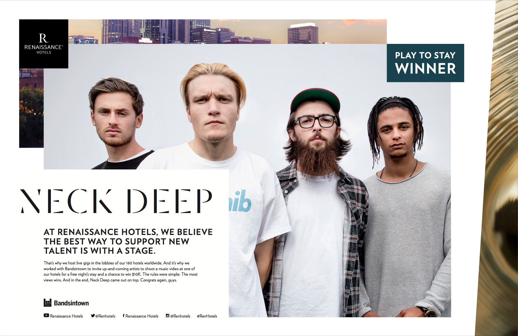 We're loving this double-page print ad that ran in a recent issue of Billboard magazine congratulating Neck Deep on their Play To Stay victory. It was awesome working with our partners over at Billboard and Renaissance Hotels and we are highly appreciative of all of the great artists who submitted videos of themselves performing in hotel lobbies and bathrooms across the country.