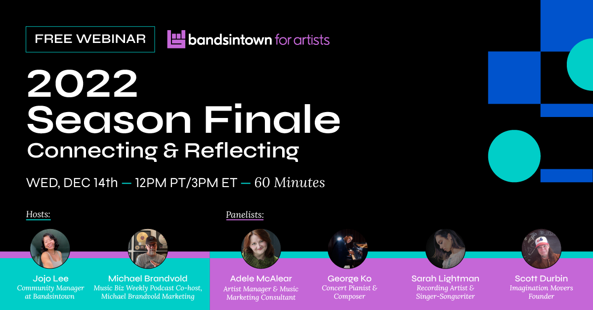 This session will be led by Bandsintown’s own Community Manager Jojo Lee, along with Co-host of the Music Biz Weekly Podcast, Michael Brandvold. Our hosts will kick off panel discussions then lead a Q&A where Scott, Adele, George, and Sarah will be answering live questions from the chat.